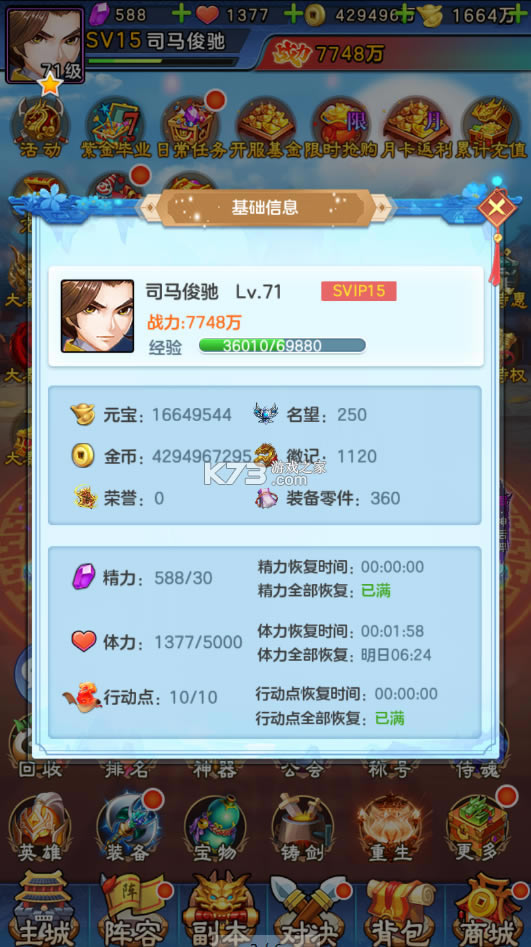 ★创角即送领取方式:创角即是SVIP15状态,秦晶、金币、元宝、体力直接在角色身上,总计10000元真充卡在背包中
