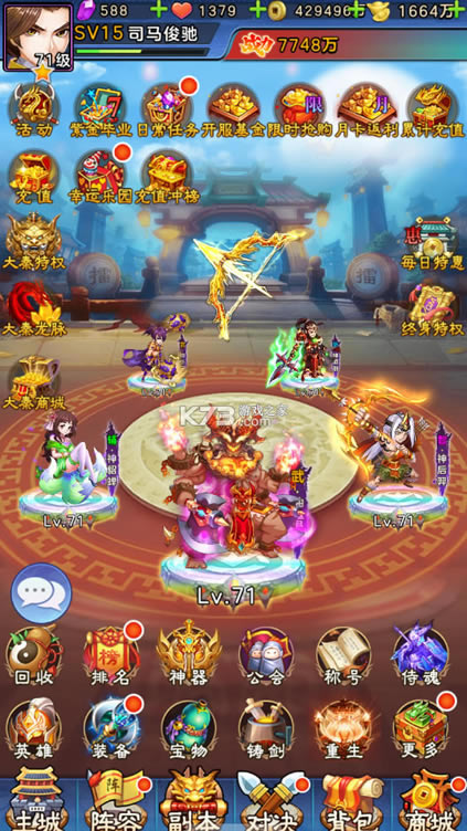 ★创角即送:满级VIP、200秦晶、10000元真充卡、8888万金币、888万元宝、5000体力