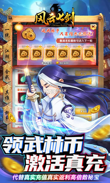 ★【专属武林币】:代替真实充值购买豪侠大礼包,真实返利高倍数秘宝、现金卡和顶级品质碎片,通关突破星数还可领取高额武林币,一直闯关一直送,丰富资源免费拿