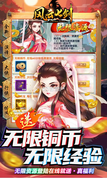 ★【版本专属】:专享终身特权:一次购买,终身享用。仗剑令:BUG特权,免费每日领取进阶礼包!侠客令:终极特权!无限觉醒突破必备!英雄令:究极特权!无限进阶必备!盟主令:至尊特权!无限紫金碎片和资源!
