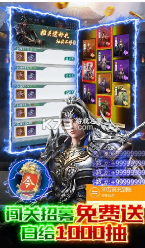 3、闯关!挂机送大量真充卡碎片,不花钱免费合成千元真充卡!闯关还送千次武将招募,名将招募可刷新重置,直接招募到您想要的武将!不浪费每一次的招募道具