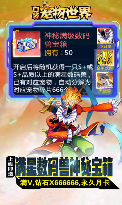 ★上线就送VIP18,钻石*666666,月卡*1,金币*1000W,神秘满级数码兽宝箱*1