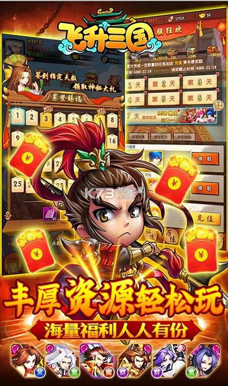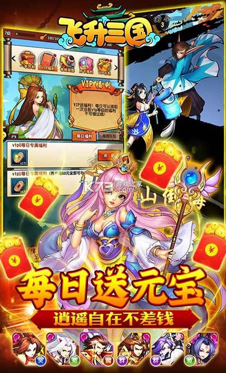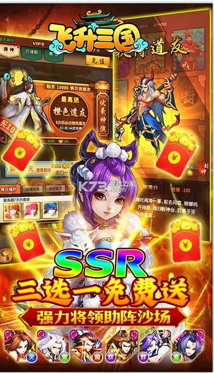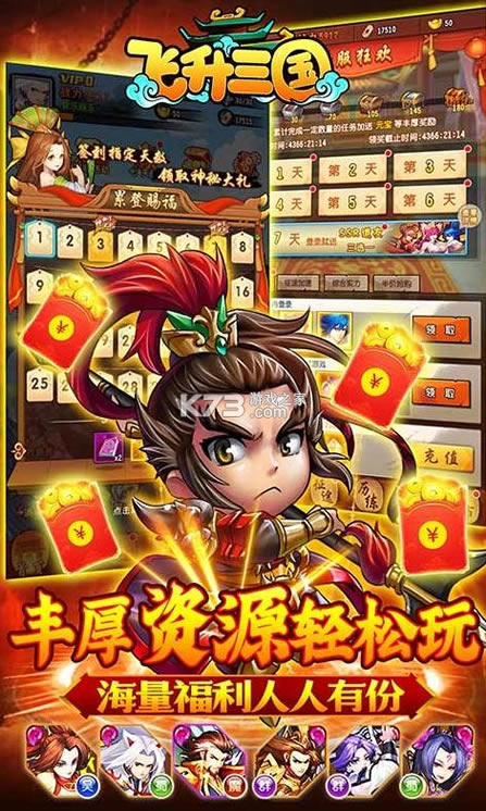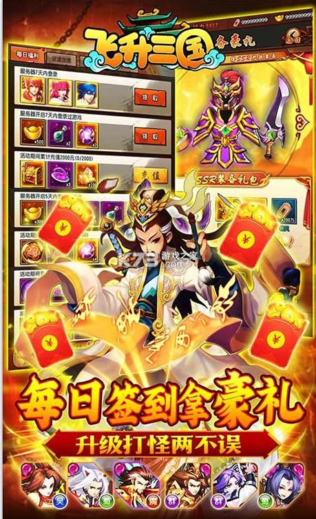 《飞升三国百将争霸》最紧张的刺激战斗感,搭配更加真实的历史故事,巅峰了传统的剧情,十连抽必得SSR武将,丰富的资源轻松玩,海量福利人人都有份,引领武将沙场战斗,升级打怪两不误,每日送元宝,不再缺钱。