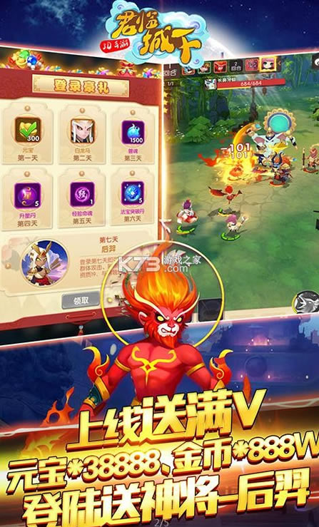 ★上线送满V+元宝*38888+金币*888W,每日登录签到就送充值卡;