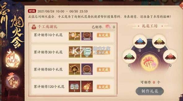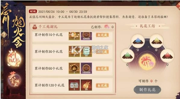 夏日凉夜短,烟花如雨落。烟火大会举办在即,不巧制作礼花的原料短缺,千工苑只好求助玩家“使君”帮忙收集,并为各位玩家“使君”准备了丰厚谢礼!各位玩家“使君”集齐原料、成功制作礼花后,可邀请一名忘川名士燃放礼花。各位玩家“使君”快来邀请喜欢的名士共燃礼花,同看烟火!