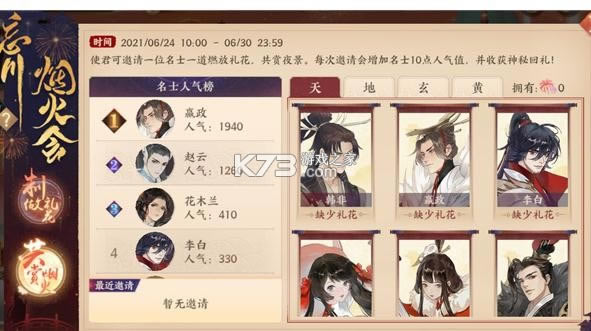 活动玩法:活动期间,玩家“使君”参与日常活动既有概率获得绯色、黄色、蓝色、绿色4种礼花原料,消耗指定数量的4色原料可制作1个礼花,制作的礼花达到指定数量即可收获千工苑谢礼。礼花制成后,玩家“使君”可邀请一位名士共赏礼花,每次邀请消耗1个礼花,邀请成功后获得该名士随机回礼1份,每次邀请将为名士增加10点人气值。(说明:名士人气值不决定任何名士相关收益,也不作为后续开发方向参考。)