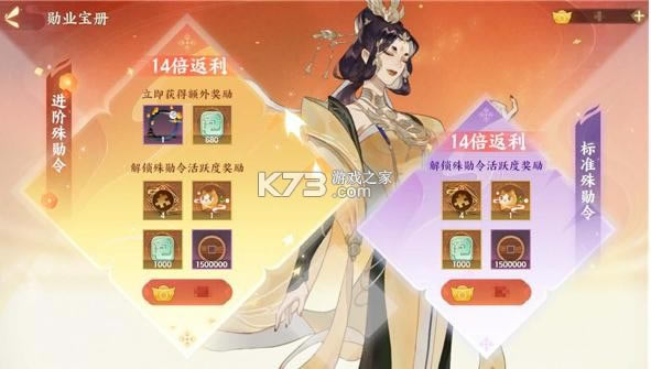 活动内容:勋业宝册含有【荣功令】和【殊勋令】两类,其中殊勋令包含标准殊勋令和进阶殊勋令。活动期间,玩家“使君”累计活跃度达到指定要求即可激活荣功令奖励;使用元铢可开启标准殊勋令、激活额外奖励,开启进阶殊勋令更有额外好礼掉落!活动时间结束后活动入口将自动关闭,已激活未领取的奖励会通过邮件补发至玩家“使君”处。
