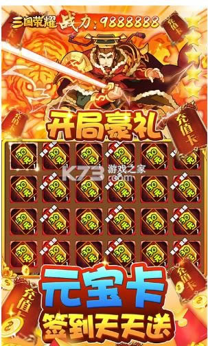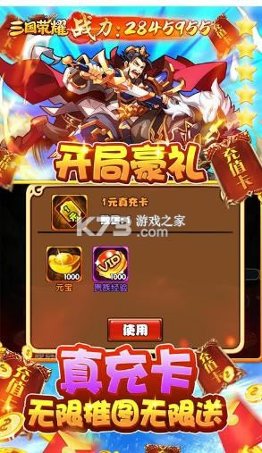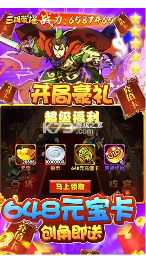 ★上线超值福利!登陆就送28888元宝、1000W银两、648充值卡,福利在送至尊1、三国著名武将鼎力相助,征战三国乱世。