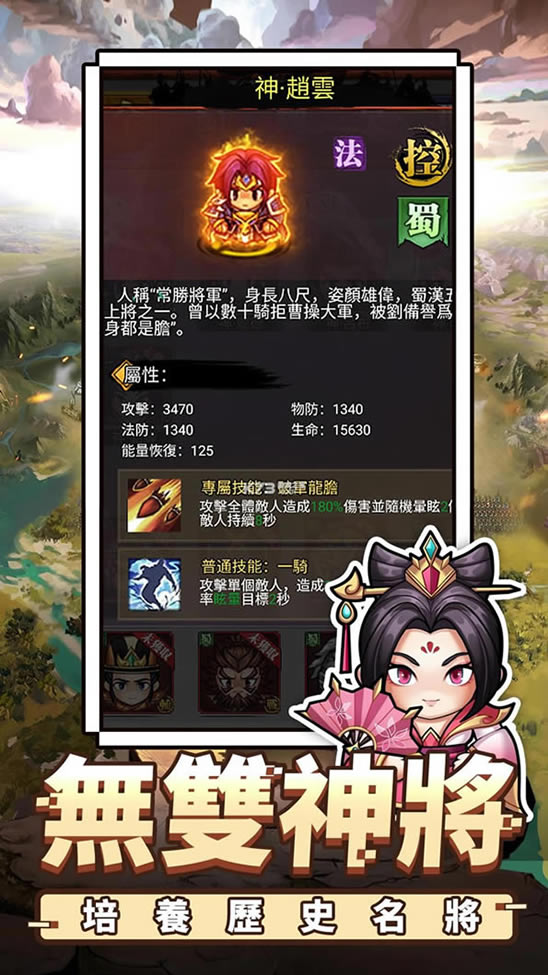 以玩家最熟悉的三国题材,结合复古像素风格,打造出熟悉却又别树一格的游戏体验,并且采用放置型玩法不用爆肝打关卡,轻松获取素材培养你心仪的三国武将,游戏中的武将富有个性,他们可爱又帅气,还有独特属性专属技能等你来收集,和他们一起在乱世中大闯特闯,让你的名字威震整个三国时代。