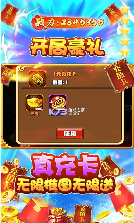 ★后缀说明:游戏内每个关卡首次通关,即赠送真充卡道具,真充卡道具使用后可获得元宝,VIP经验,可激活线上活动。
