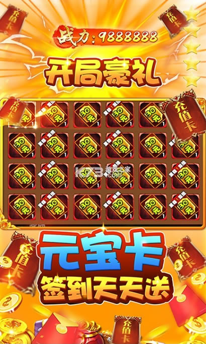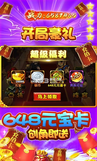★上线超值福利!登陆就送28888元宝、1000W银两、648充值卡,福利在送至尊1、三国著名武将鼎力相助,征战三国乱世。