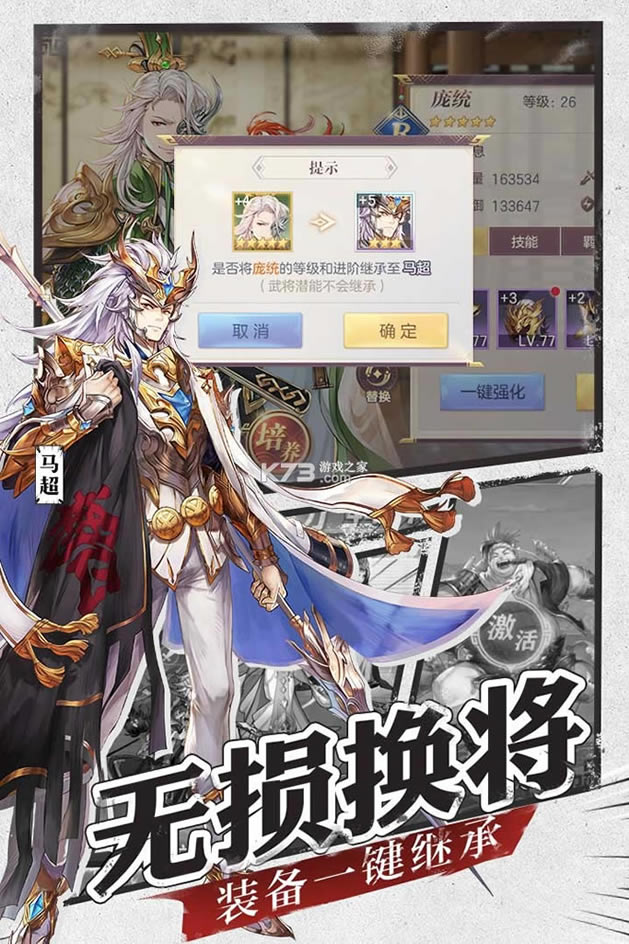 游戏中每个武将都有着各自的专属技能,同时拥有多种潜能组合,玩家可以根据战场以及阵容来自由变换武将定位,决定武将培养方向。值得一提的是,每个武将都可以通过试炼提升到无双境界,不再受限于稀有度、品阶限制,只要用心培养,武将都可以是最强的。武将养成方面,玩家也不用担心重复养成的问题,游戏中武将装备、等阶都可以一键继承,在变阵换将时可以无损转移。