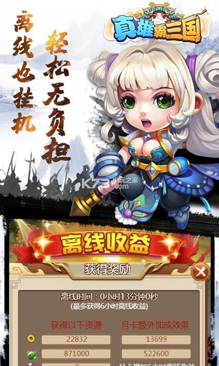 《真雄霸三国》是一款以三国时期为背景的Q版卡牌新作,24小时轻松离线挂机,运筹帷幄之中,决胜千里之外!