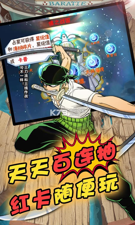 《草帽航海王百抽版》是一款与众不同彰显出游戏当中极致激情游戏乐趣的最新海贼王动漫改编游戏,《草帽航海王百抽版》是以最新技术全力打造而成的爽快手游世界,多重理念应有尽有,个性玩耍体验其中无敌的畅快乐趣。