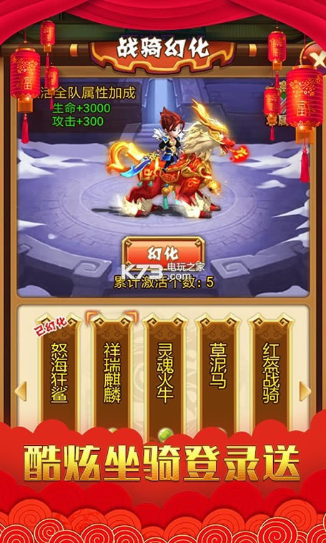累计充值3000元,额外获得:红将碎片箱*500(任选红将碎片2500个),金色兵符任选包*240,12级血鳞生命石*3