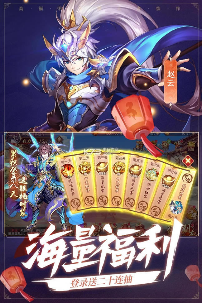 游戏独创“名将传”玩法,让你化身名将,亲历三国战场,体验动人心弦的专属剧情!看张辽威震逍遥津、观赵云七进七出长坂坡!名将传剧情还力邀声优大咖倾情加盟,演绎出不一样的少年三国!还有秘境寻宝、叛军围剿、军团副本、封地巡逻,50余种玩法让你的少年之路充满热血!