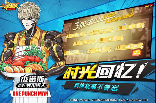 英雄参上!一拳K.O.!?历时两年精心打造!正版授权《一拳超人:最强之男》即将与各位英雄们见面!?怪人的魔爪已经向世界伸展!埼玉的铁拳已经蓄势待发!?各位英雄们!你们准备好了么?快来加入我们!