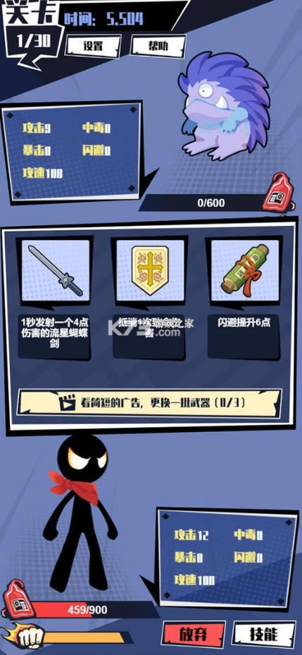 一个选择技能和装备闯关的游戏。游戏的目标是搭配不同的技能以及装备的组合,闯关,还有和人对战。