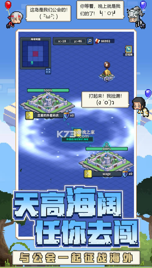 冒险从来不是孤独的旅程,你还可加入各大冒险家公会,与小伙伴一起征战星辰大海!合纵连横,用你们的智慧和实力,拿下属于自己的海岛建大别野,成为四海一霸!