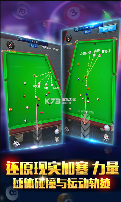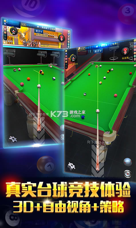 2.体感3D台球手游,还原现实台球加塞、视角(俯视、平视、旁观)、力量(击球及挥杆力量、球最多吃6库)和球体碰撞及运动轨迹,体现真实台球技术和水平。