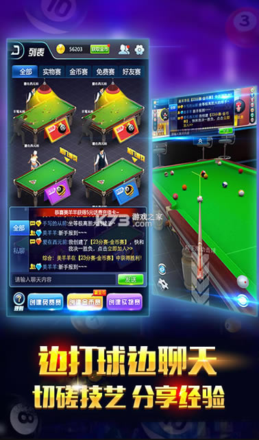 电竞台球是国内首创3D体感台球手游,利用手机传感技术,只需“摇”“晃”手机,即可实现视角调整和击球,给您小型VR台球的游戏体验。并创建了以线下台球厅为基础的球友社交社区。在这里不仅能跟全国台球爱好者聊台球、交朋友,更能通过体感3D手游练技术,跟好友竞技比拼。