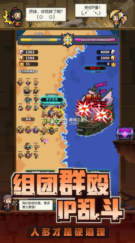 人多力量大,当代人的冒险,当然是更多更大更强!最多12人上阵,各种IP角色,还可DIY培养。随心所欲组建你自己的专属冒险团吧,然后带着一众兄弟姐妹,群殴BOSS,赢得无上荣誉!