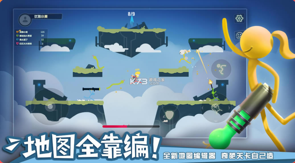 1、多人竞技,游戏支持2-4人联机及同屏对战,火柴君们需要利用机关、地形、枪支武器杀掉所有人成为最后的幸存者。