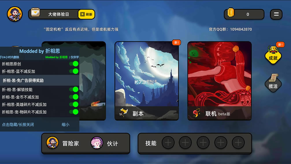 破解内容:内置破解菜单 大量英雄碎片,宠物碎片,技能无cd,免广告等 解锁全部技能后技能升级无效果。