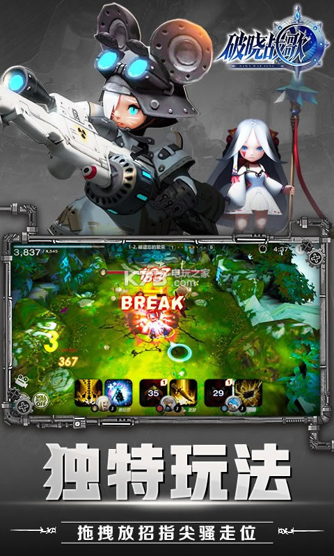 《破晓战歌》是由网石参与美术打造的一款幻想朋克动作冒险手游。充满复古机甲、飞空艇的自由冒险异世界为你打开,宏伟复古飞空艇魔法科技宇宙背景,沉浸式空间感立体CG剧情,每一帧都经过精心打磨,故事情节环环相扣紧张起伏,为玩家打造刺激又美丽的浪漫冒险世界,独创异能酷萌主角多达300位,多种新颖战斗玩法带给你不同惊喜:风骚走位、拖拽放招、随时中断BOSS技能以及突破弱点攻击玩法,强互动性系统,邀请给力好友和你一起战斗,带你感受畅爽打击外挂级的痛快!精致设计副本,3维空间让你亲临战斗,数十种巨人BOSS轮番任你挑战,更有五星角色福利随机掉落,一起与飞空艇出发冒险吧!