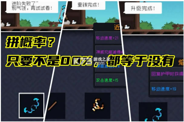 从一把最低级的武器到最后成为真正的神器,这个过程不可谓不复杂,用不同品质的配件所组合出的结果就会呈现出完全不一样的效果,更高阶的进化形态又将触发不同的属性加成,这种逐步增强的玩法机制,让老宅有一种仿佛在玩网游的感觉。如果当你看到了那熟悉的“强化概率”,或许也会和老宅一样,有这种似曾相识的感觉。