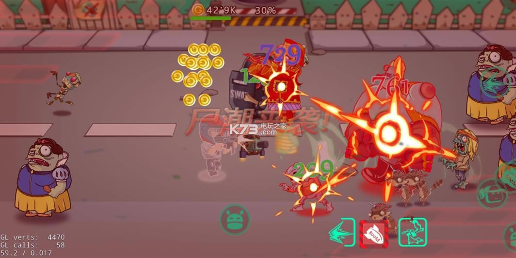 4.游戏中的僵尸boss虽不比传统横轴闯关?中那么变态,但也各个身怀绝技,并且在游戏进行到一定阶段后,它们还会组队来袭,一定会让你集中精神,忘记很多烦恼~