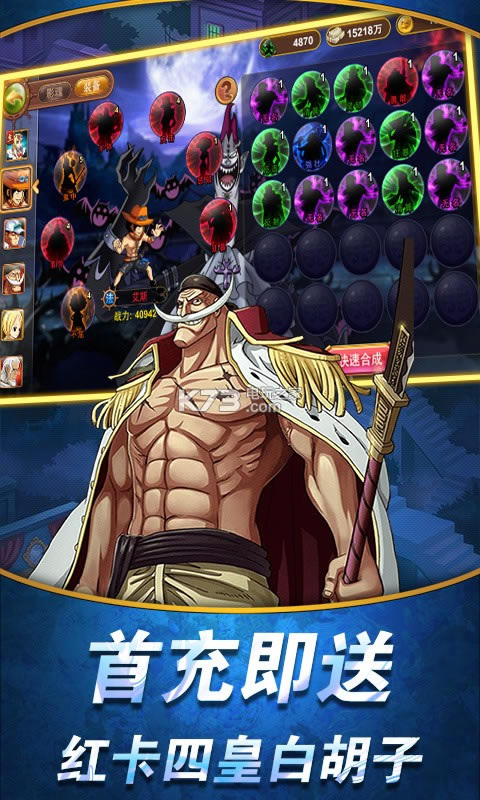 经典日漫原创大航海题材卡牌手游,游戏精致还原动画经典,原味再现顶上战争的宏大场面。上线即送VIP20,金币*30000,贝里*300w,四皇、王下七武海、海军三大将都可成为你的伙伴,伟大航路等你来征服。