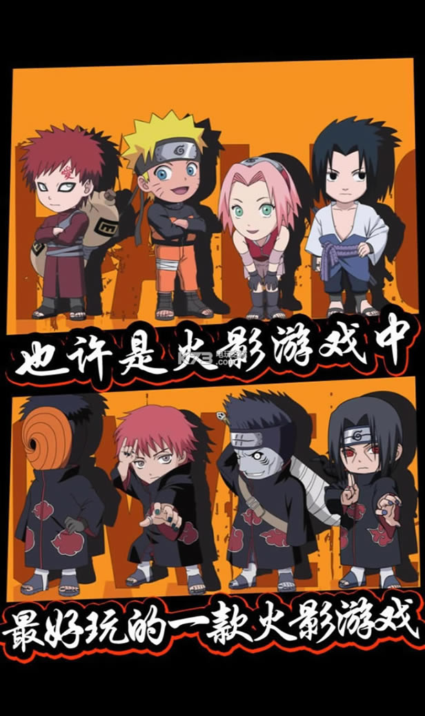 2、游戏将火影中的人物全部Q版的重现于游戏中,玩家只需要将他们收集到手,就可以组成属于玩家自己的最强队伍!