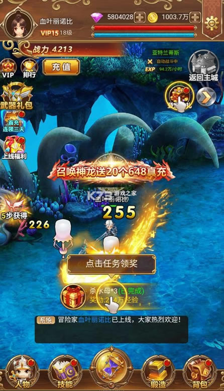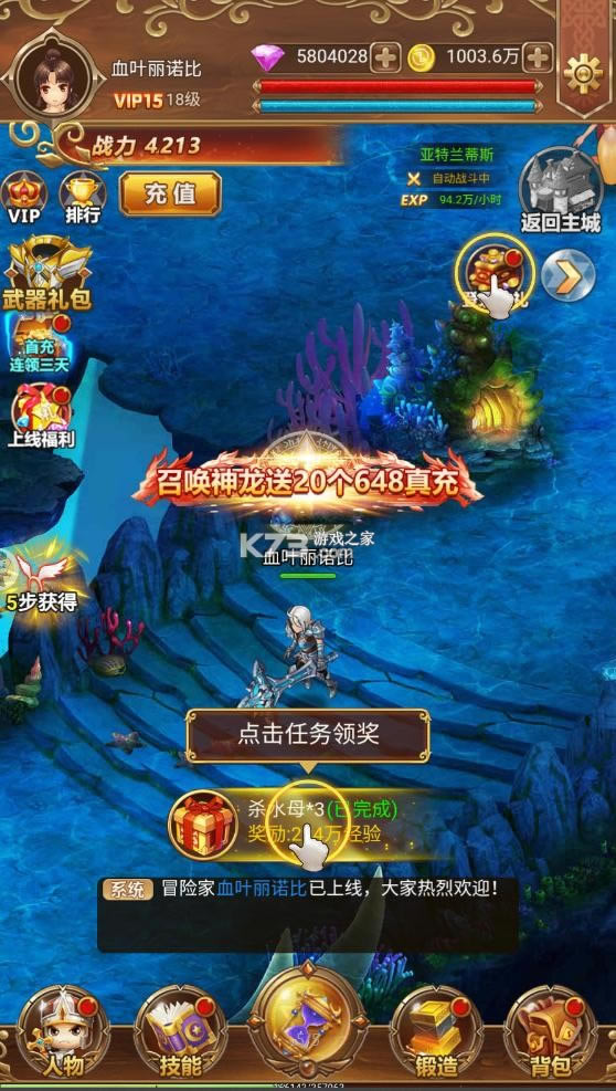 福利礼包:高级灵力液*1,宝藏钥匙*3,强化石*30
