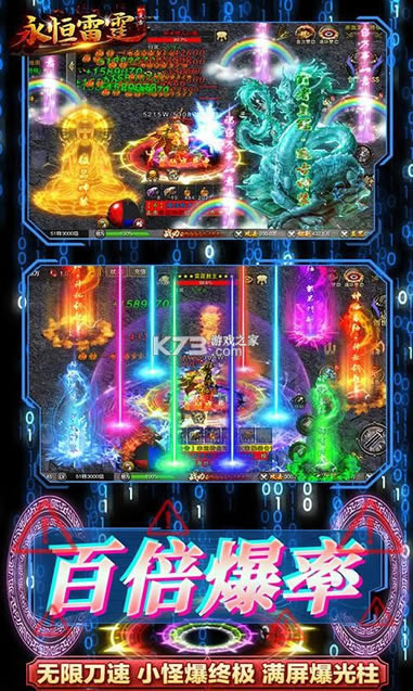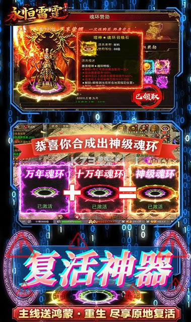《永恒雷霆-魂环攻速版》上线送钻石20万,元宝1亿,战狂★魂环特权,创号免费领取,炫酷魂环外观。主线一点秒升百级,一款独创1秒99刀,无限攻速,百倍爆率,所有装备,所有特殊装备以及材料游戏内全部能爆。主线送复活神器【鸿蒙·重生】,享受死亡原地复活。极品吸血武器,刀刀暴击,刀刀吸血。特色狂暴系统,刀刀切割,满屏爆光柱。装备全靠打,小怪爆终极。