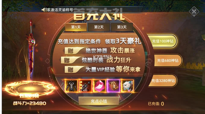 特权礼包:8级攻击宝石*1、深渊首领凭证*2、金币*300W