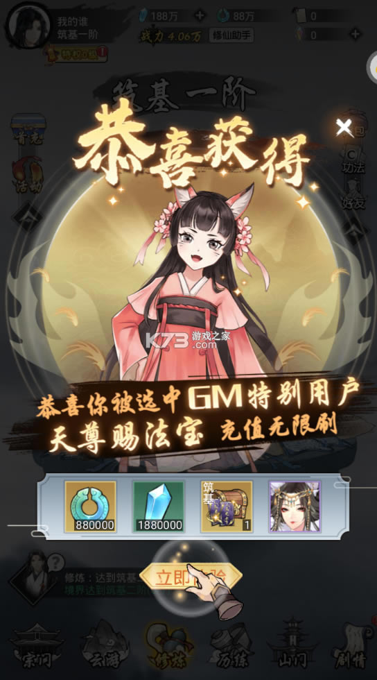 ★创角即送:GM特权,“天尊赐宝”法宝加持,仙玉*88W,灵石*188W,洞天“寒冥仙府”,双修道侣“九尾妖狐·妲己”