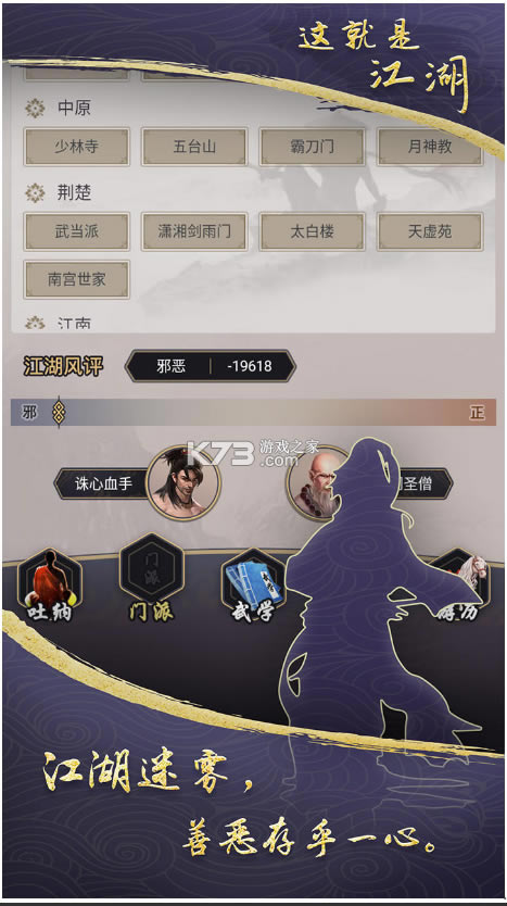 水墨画风的武侠对战养成冒险游戏。玩家可以选择自己的出生,天赋是随机产生的,玩家在之后的冒险中将自由地养成,玩家做出的每一个选择都会影响自己的善恶值,正与邪一念之间。各种机遇事件,玩家有机会平步青云。游戏没有华丽炫酷的特效,主要以文字和图片来展示,给玩家小说阅读般的游戏体验哦