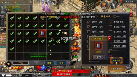 6.爆率全开的同时玩家快速升级,自动掉装备快速回收,最刺激的玩法,最经典的传奇。