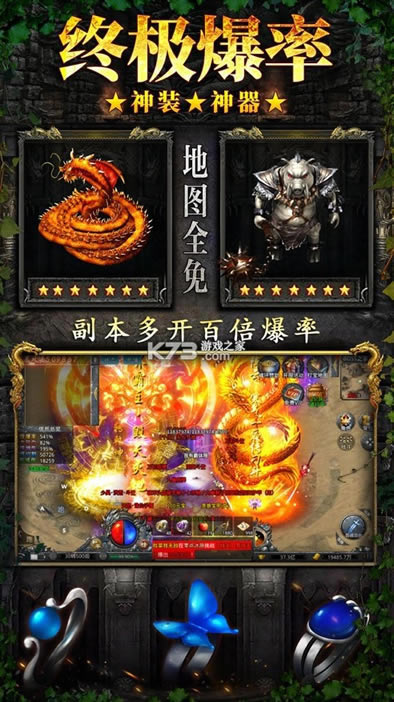 拥有海量BOSS副本、装备爆率超级高,神器、神兽、萌宠等,一应俱全。