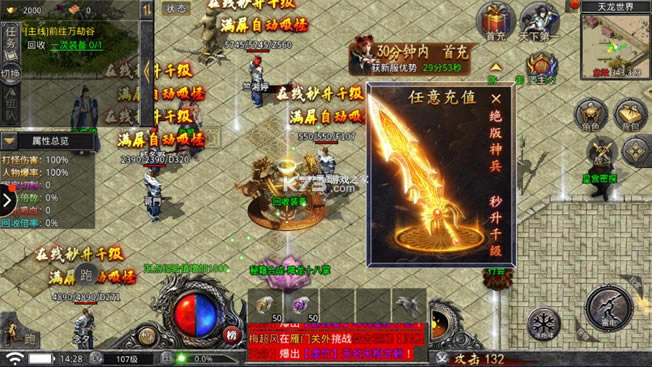 1、新增天魔来袭活动,开服10天后开启,从跨服战场界面进入。每周二、四、六,14:00~14:30玩家可进入活动地图,地图内所有BOSS均为行会归属,击杀天魔首领,可获得符文装备、江湖令和各种材料