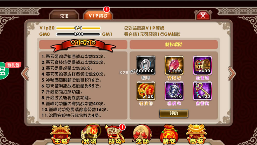 专属礼包:元宝*500000、强攻令*5、招募令*10