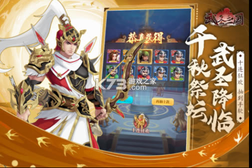 -丰厚元宝、十连抽、五星神将等开局资源包,让你赢在起跑线;疯狂十连,带你组建神将天团;八天登录,姜维、潘凤收入囊中;福利礼包随机掉落,一朝暴富不是说说而已!