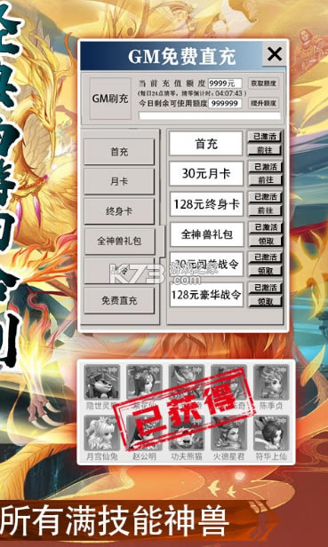 1.上线送GM直充工具,500充值额度,直接激活首充、月卡、至尊卡、战令等活动,闯关拿到800额度可以买全神兽礼包,拿所有满技能神兽。