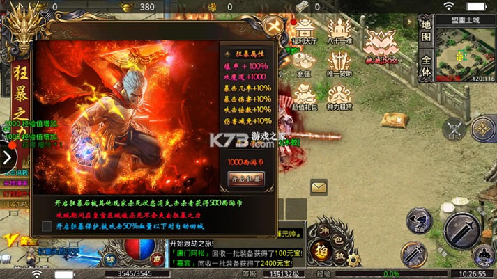 1:角色养成:砍怪爆装,称号时装均可强化进阶,龙印合成,辅装合成升级。