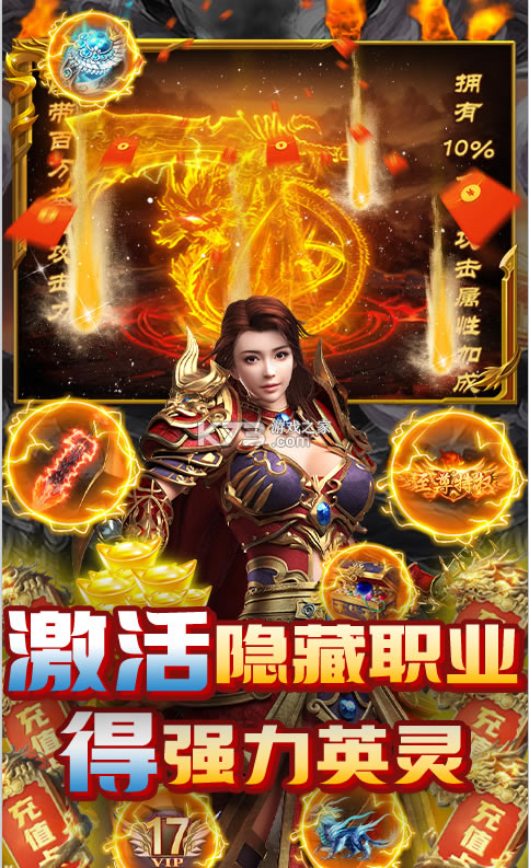 游戏支持离线挂机打怪,装备也可自由交易,延续经典的铁三角职业设定,战法道再现英雄合击,超强必杀技全屏秒怪,打boss刀刀切割,给予你非一般的专属体验!另外,烈焰重生中还有跨服攻沙,进驻名人堂,争霸史上最强公会等玩法