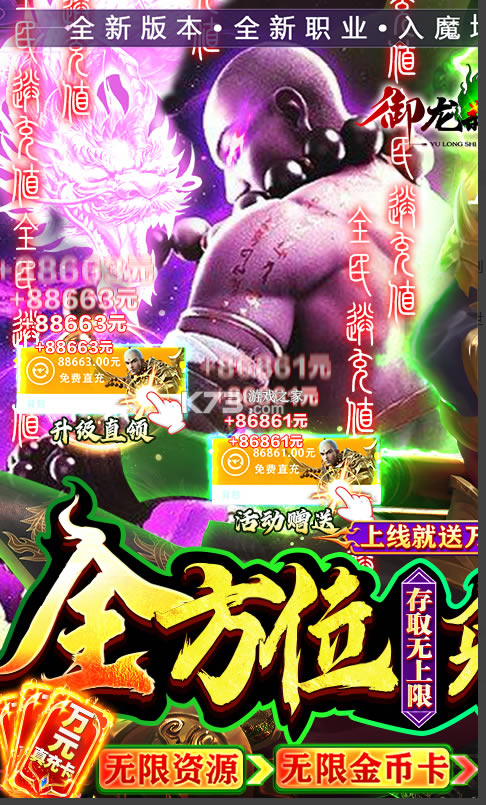 ★免费送首充领GM武器,挂机即可刷满直充币,激活神尊卡天天免费送至少500元真实充值。天天在线送巨量寻宝令,无限抽取真充和极品装备!