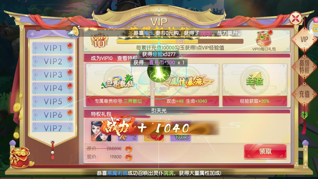 ★上线送VIP10、10w魂玉、10w绑玉、100元充值卡、20000直充币、时装:雀之魂
