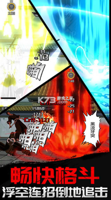 拳皇式的畅快横版格斗,融入浮空连招、倒地追击等经典战斗元素,尽享拳拳到肉的真实打击感,为你的对手献上一记华丽的奥义大招!
