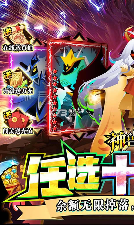 《神兽连萌》超高的概率人人都能变欧皇,海量连抽升级就送万元真充,在线送百连抽,轻松获得五星英雄,海量资源福利超级多,十星英雄免费任选,免费激活钻石和礼包,免费购买。